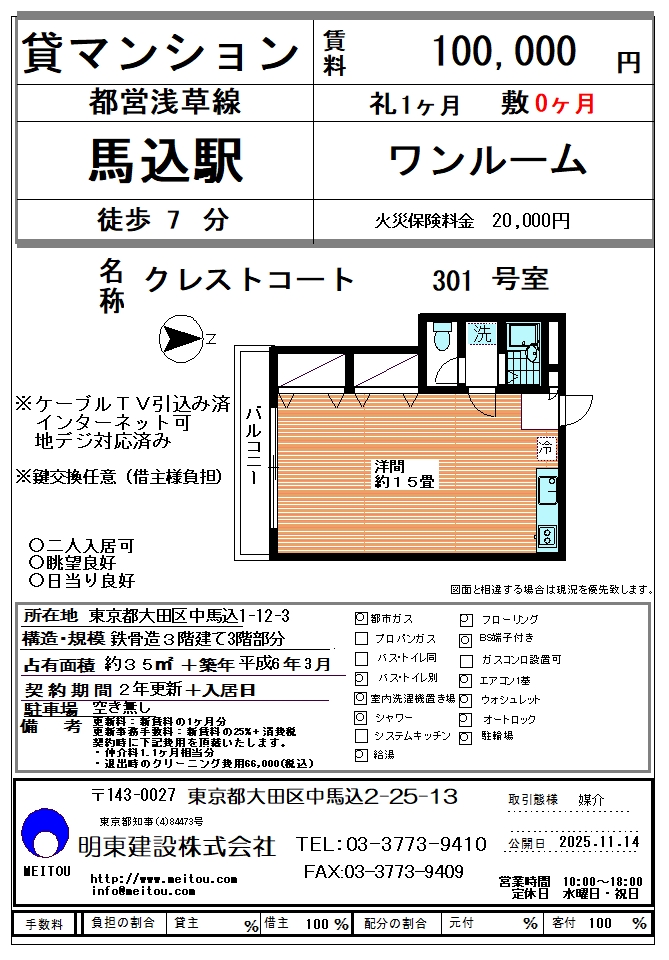 備考 契約時に退出時のクリーニング費用として、66,000円(税込)を頂きます。